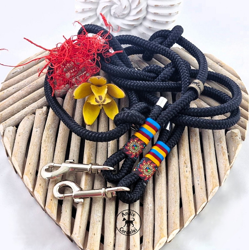 3-fach verstellbare Leine (2 m) aus PPM schwarz (10 mm) mit Standard-Beschlägen und einer Takelung aus Makrameeband und Borte.